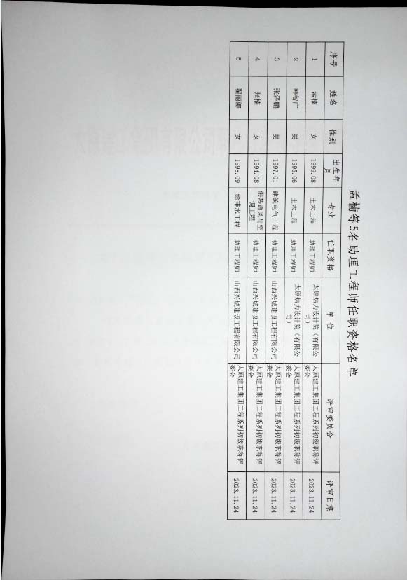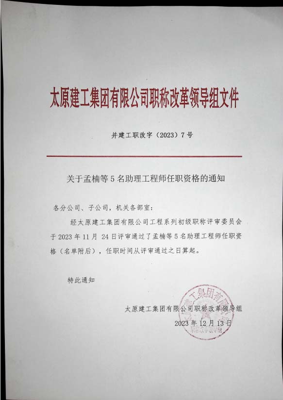 關(guān)于孟楠等5名助理工程師任職資格的通知